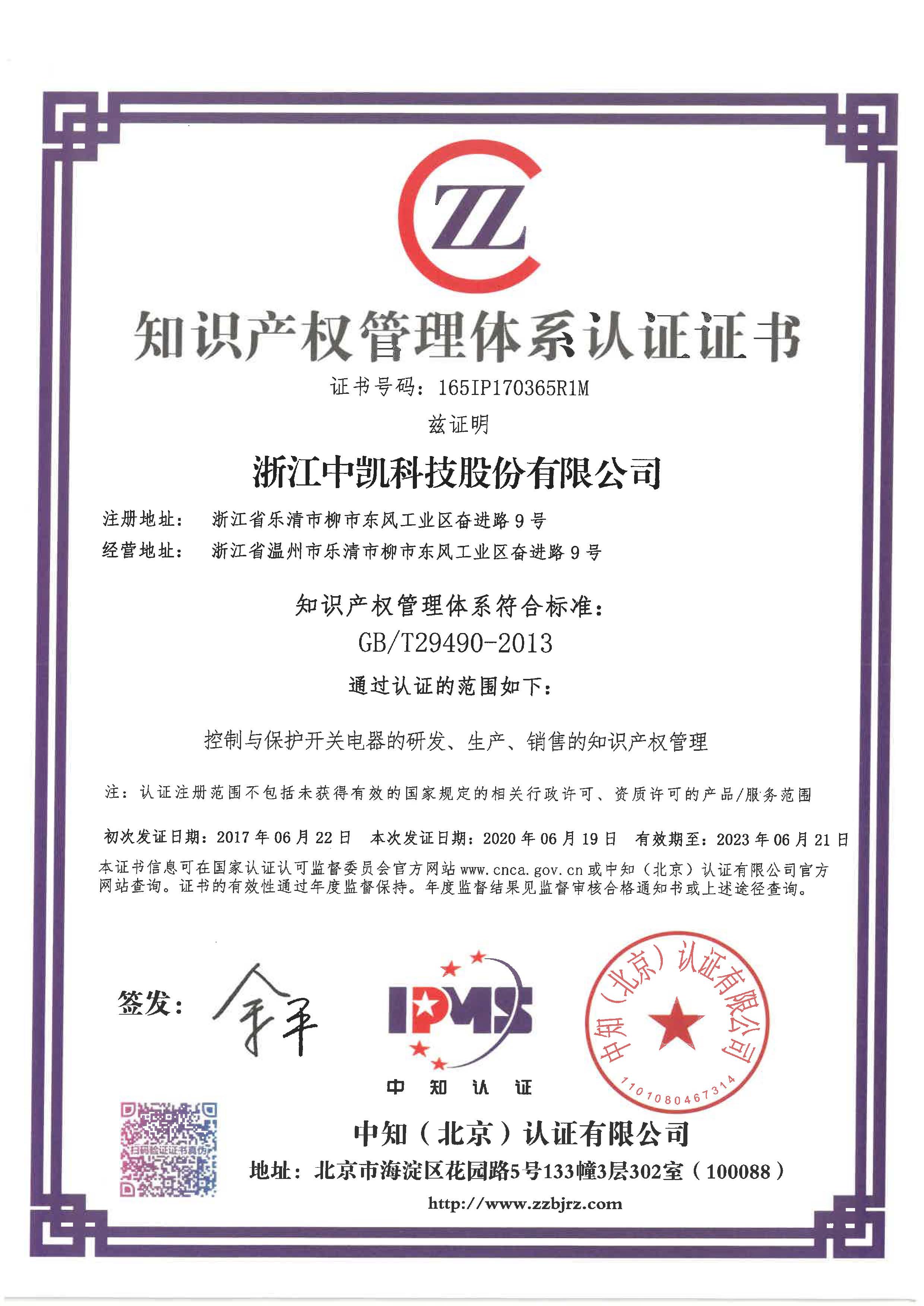 6 月19日,中知 (北京) 認(rèn)證有限公司向浙江中凱科技股份有限公司頒發(fā)《知識產(chǎn)權(quán)管理體系…